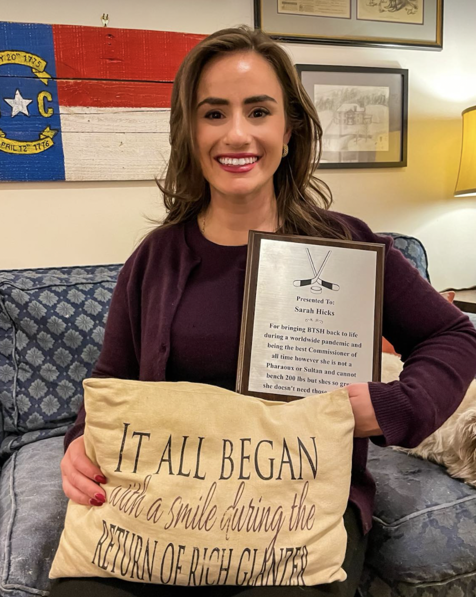 But I digress. There are fewer people more deserving than Sarah. With the worldwide pandemic started by someone in BTSH (https://btsh.org/media/karma-conspiracy-circle-who-did-the-rona) it’s only right one of us ended it…or at least curtailed it enough so we can play hockey. Hicks once said, “None of you know how much Sarah did to keep this league afloat. Hold on, I have to do my pre-workout, and take a dabbing vid and send to Derk.”