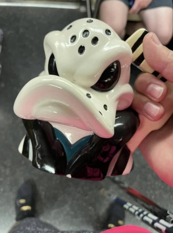 On his way to Rainbows v. Mutt Rott, stick in hand, Karl was stopped by the subway train conductor. And by “Karl was stopped” I meant literally the entire train was stopped, and the rest of the passengers had to just wait while he spoke at length to Karl about hockey and then gave him a Mighty Ducks mug that he’d found.